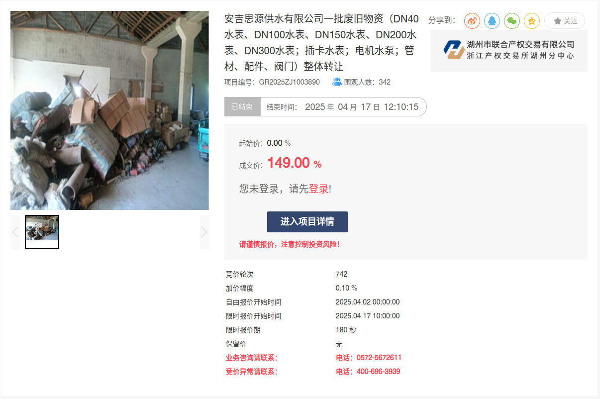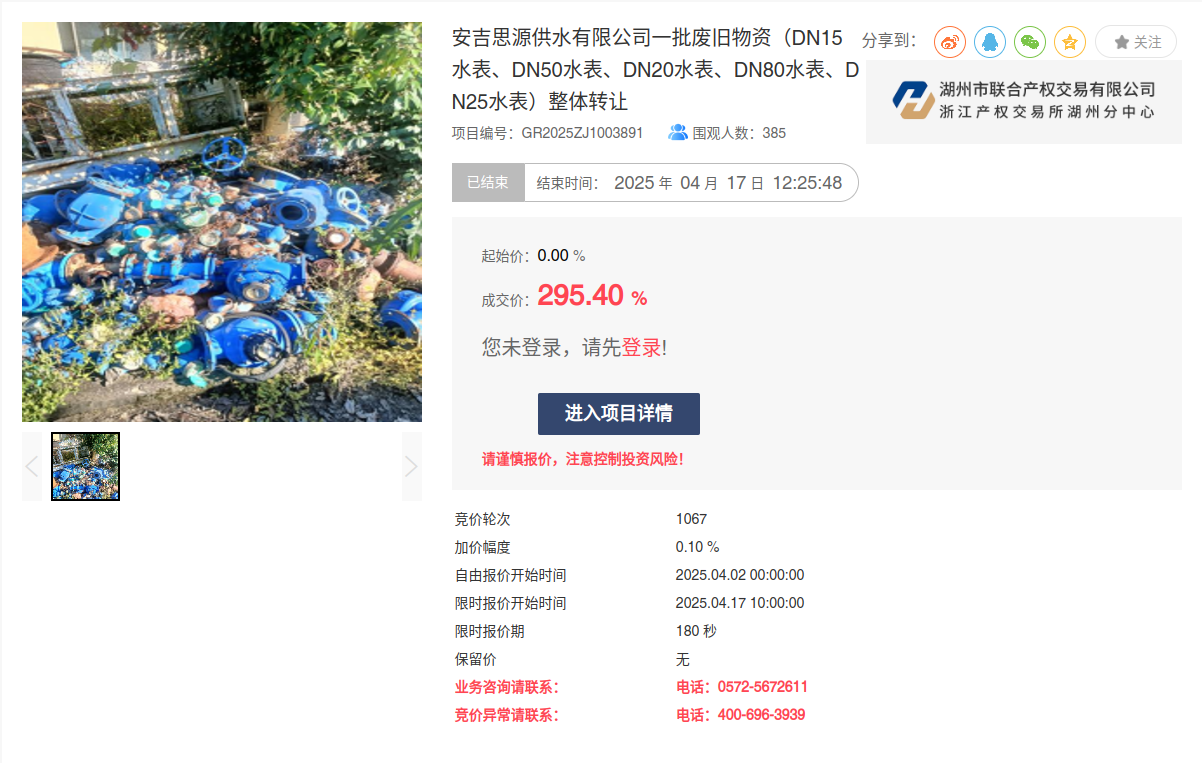 4月17日,安吉思源供水有限公司兩批次廢舊物資通過“浙交匯”平臺(tái),以“上浮率動(dòng)態(tài)報(bào)價(jià)”競(jìng)價(jià)模式實(shí)現(xiàn)高溢價(jià)成交。兩宗標(biāo)的分別歷經(jīng)742、1067輪激烈競(jìng)價(jià),以149%、295.4%溢價(jià)率成功轉(zhuǎn)讓。